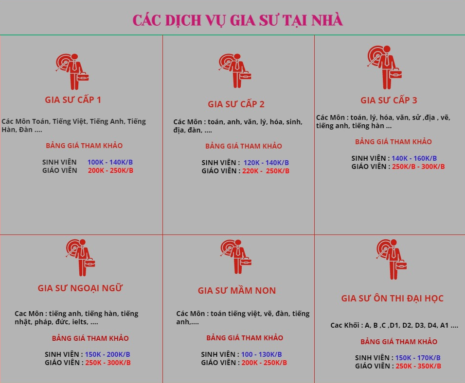Lưu ý: Trên đây là bảng giá mang tính chất tham khảo. Học phí có thể thay đổi tùy thuộc vào yêu cầu từ gia đình. Mọi thắc mắc xin liên hệ Gia Sư Giỏi 24h để được tư vấn