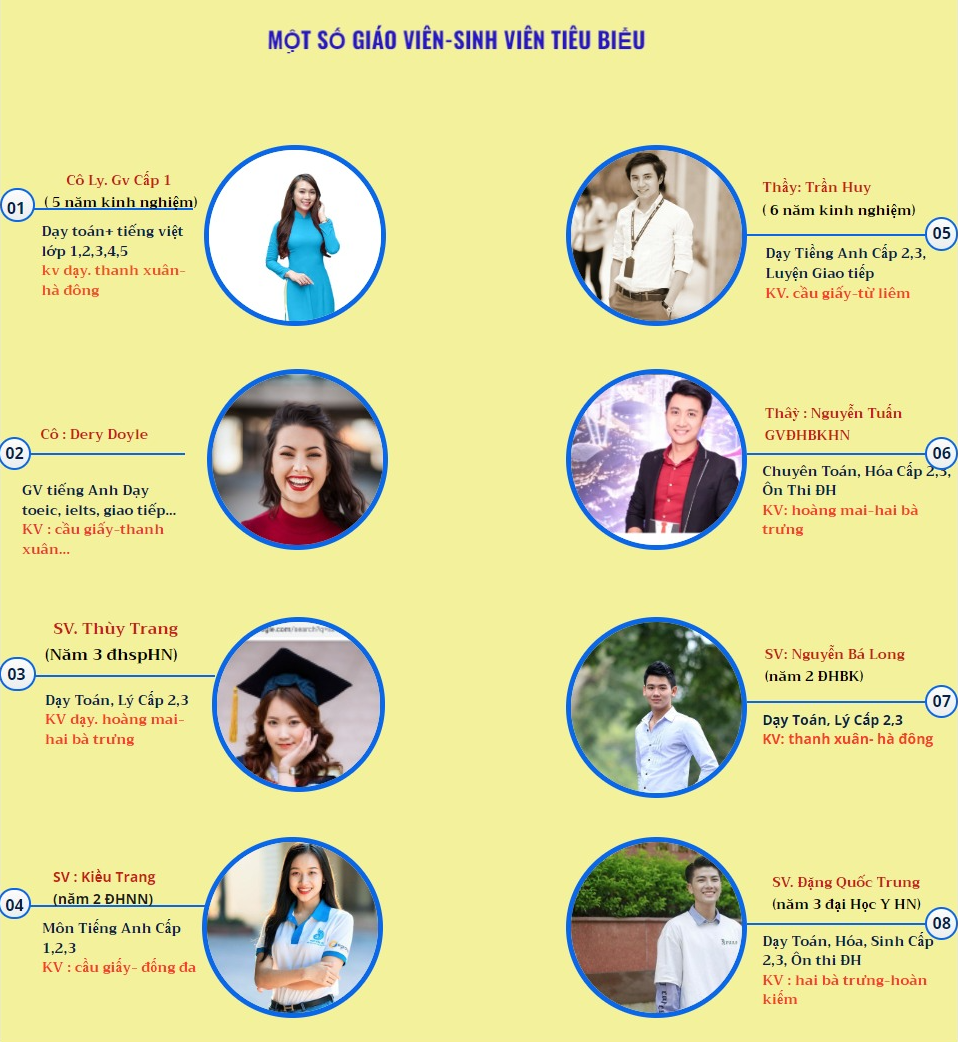 + Gia sư giỏi tại các trường top đầu chuyên dạy tiểu học như: ĐH Sư phạm, ĐH Quốc gia, ĐH Ngoại Thương, ĐH KTQD, Bách Khoa…